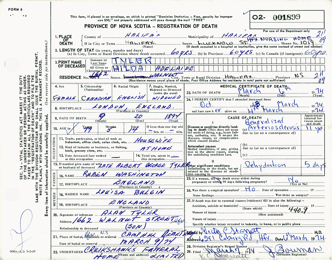 Female Death Registration: Year: 1974 number: 1899