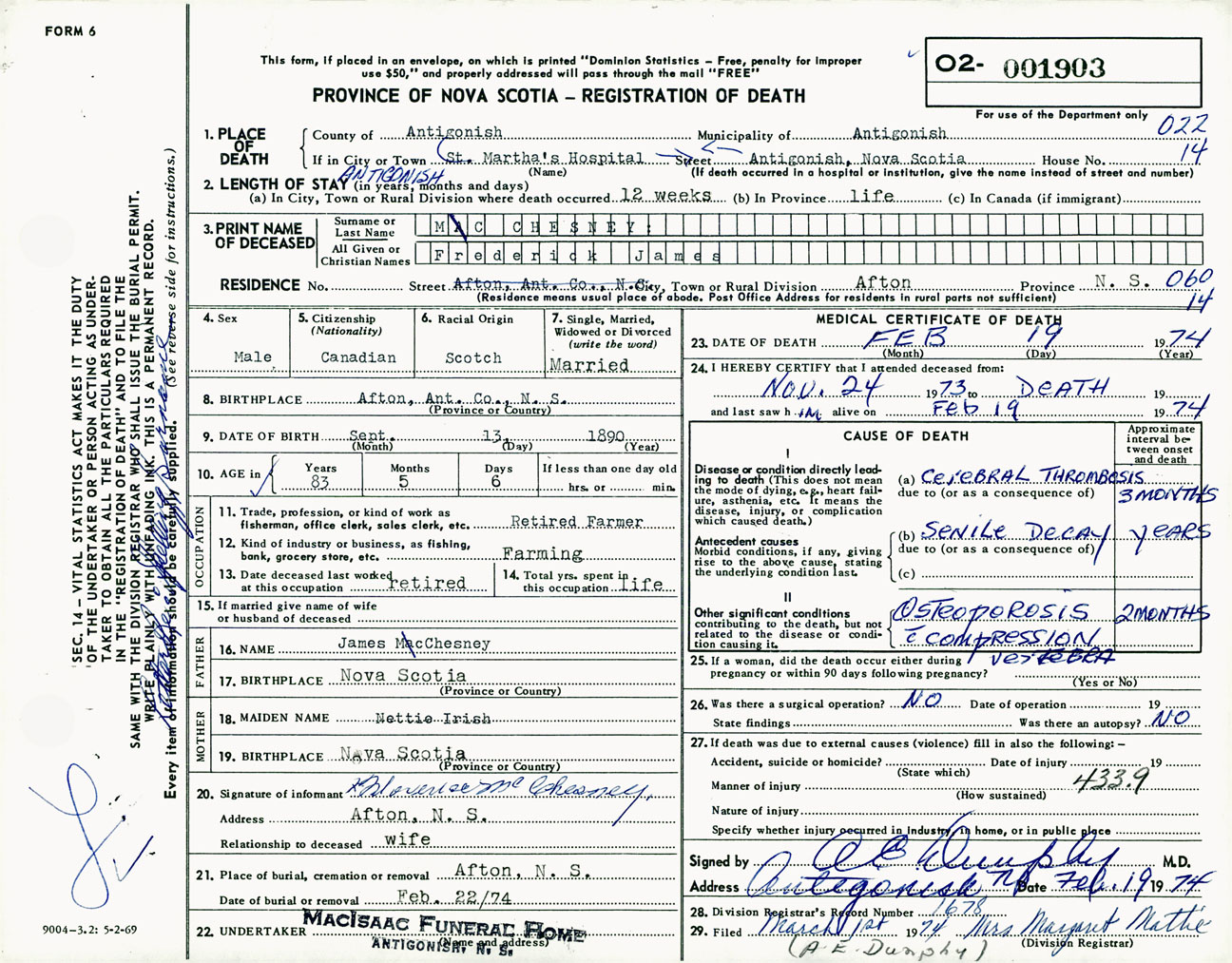 Male Death Registration: Year: 1974 number: 1903