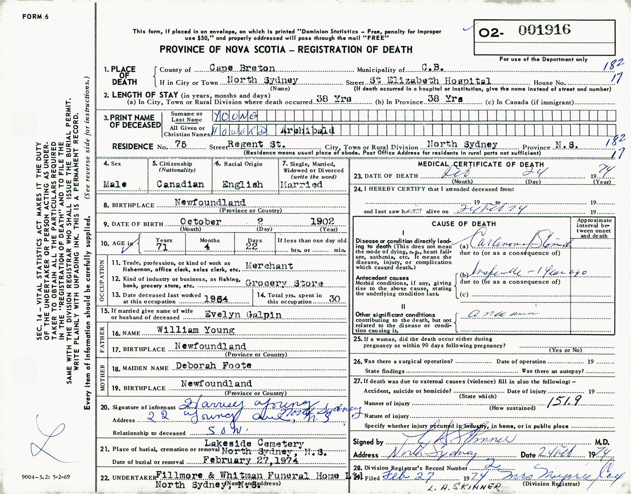 Male Death Registration: Year: 1974 number: 1916