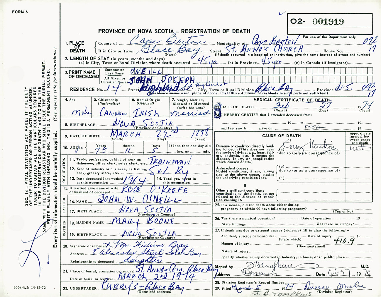 Male Death Registration: Year: 1974 number: 1919