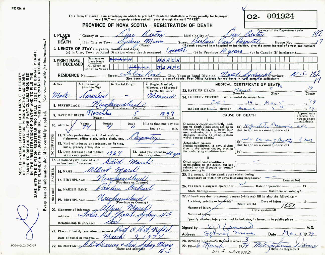 Male Death Registration: Year: 1974 number: 1924