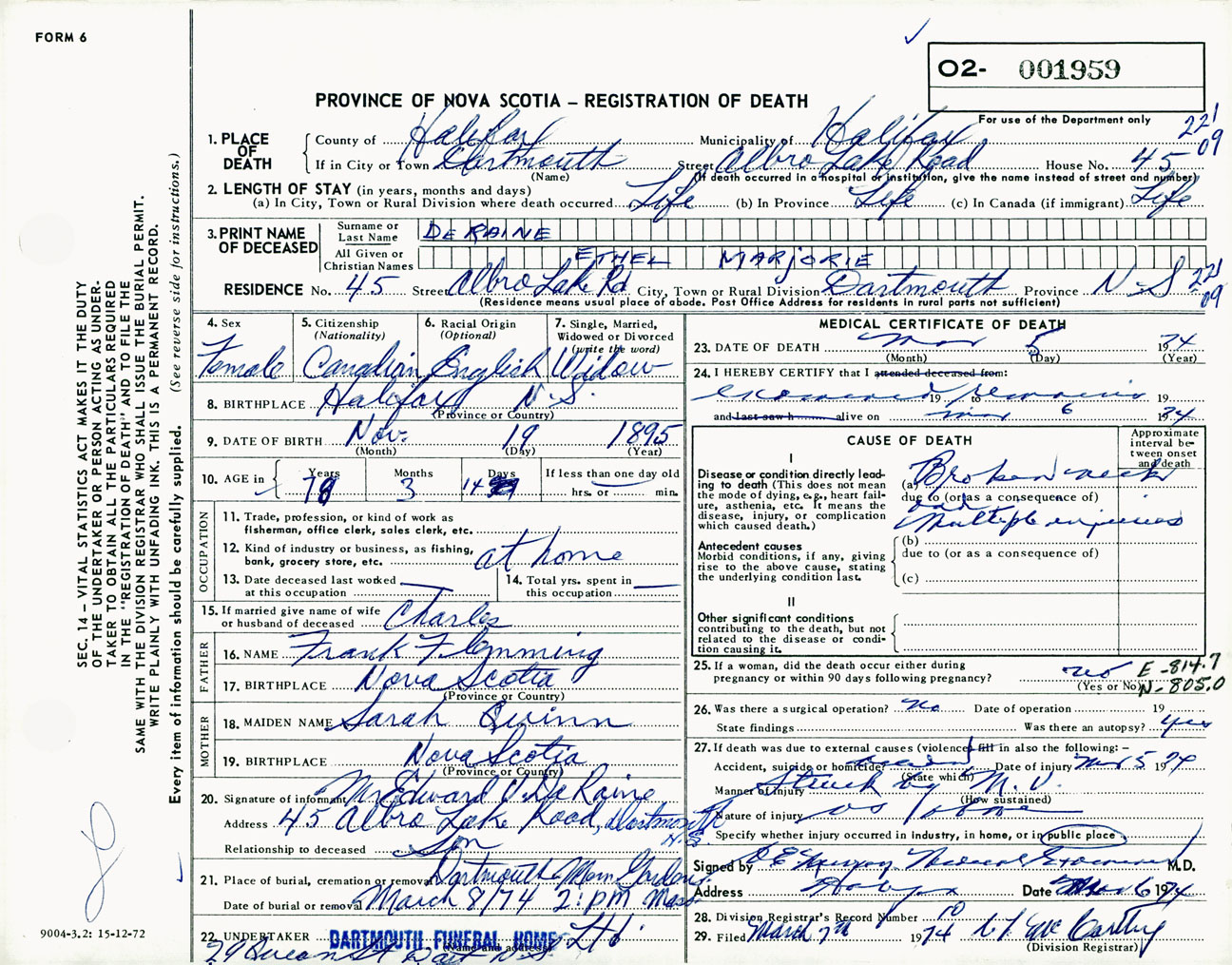 Female Death Registration: Year: 1974 number: 1959