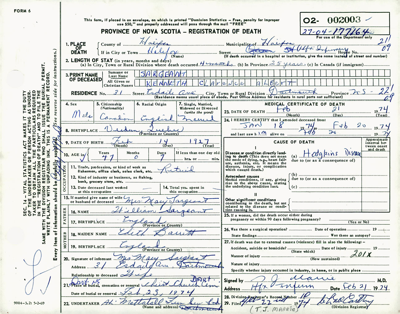 Male Death Registration: Year: 1974 number: 2003