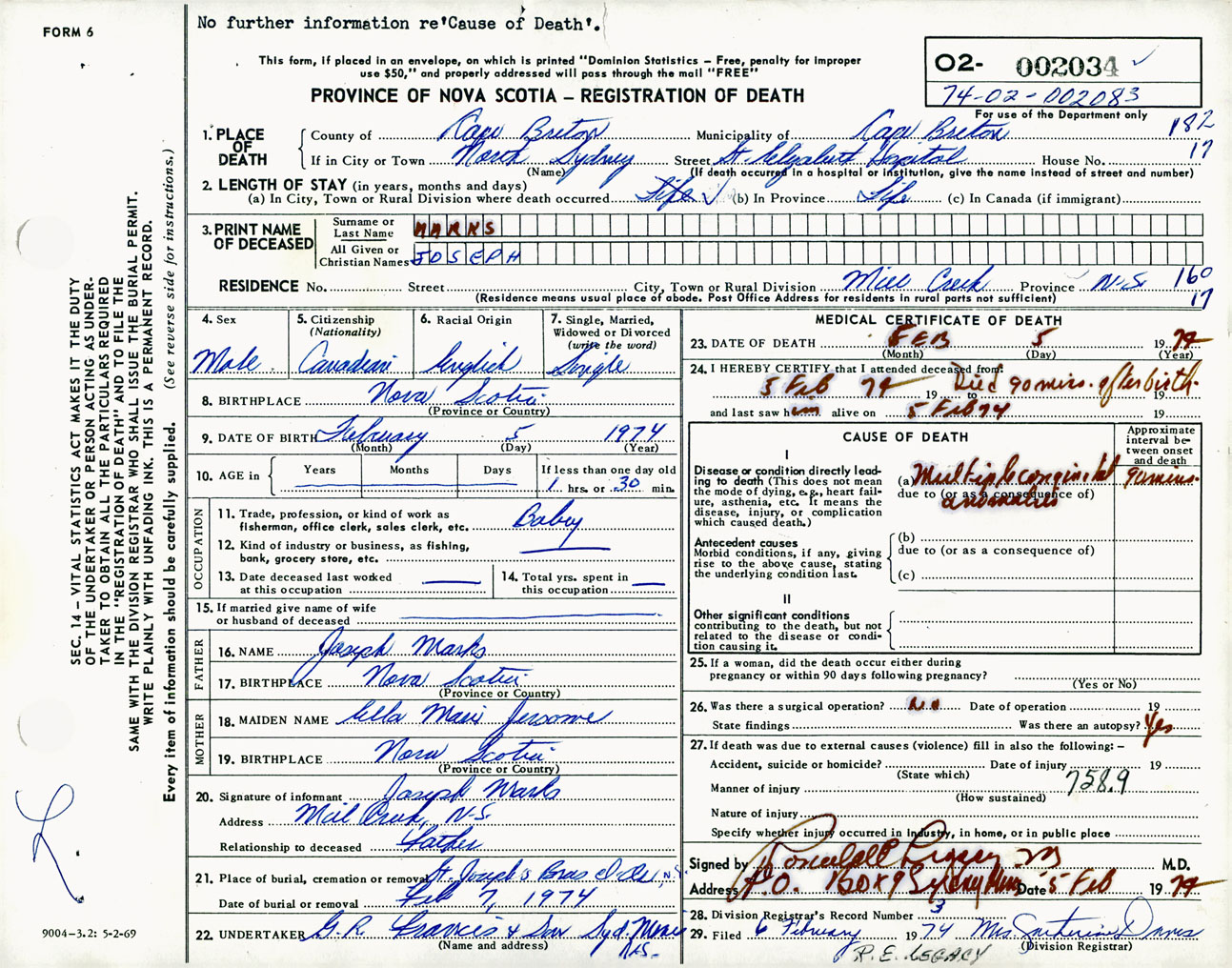 Male Death Registration: Year: 1974 number: 2034