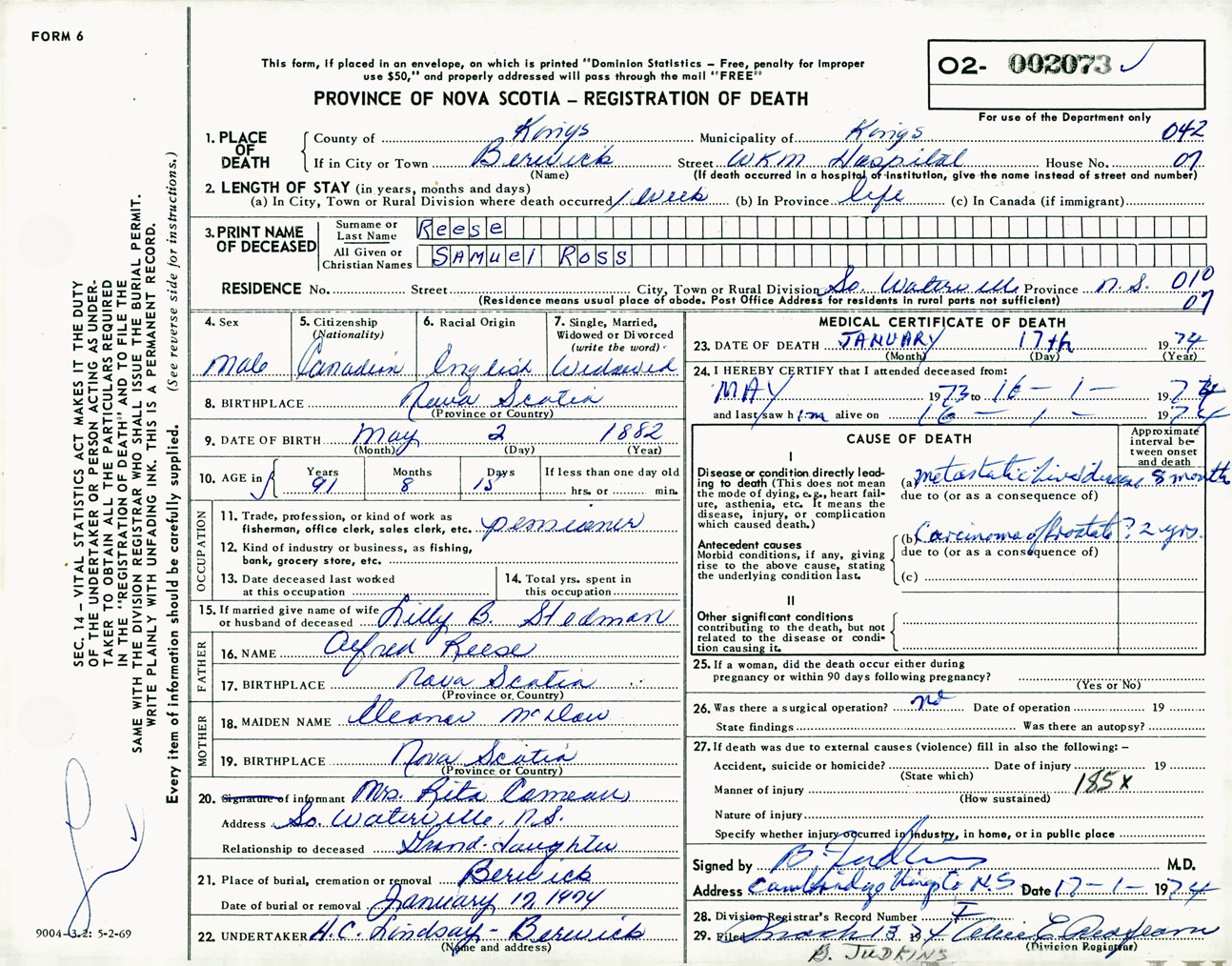 Male Death Registration: Year: 1974 number: 2073