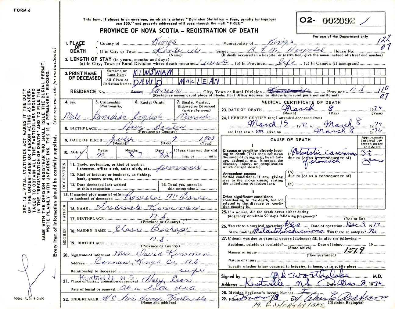 Male Death Registration: Year: 1974 number: 2092