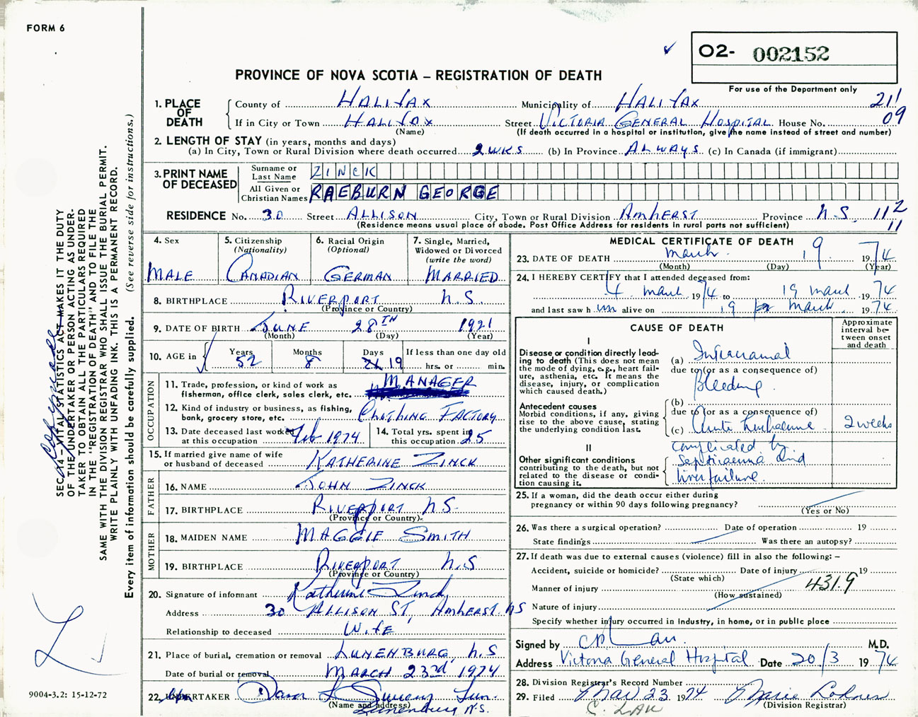 Male Death Registration: Year: 1974 number: 2152