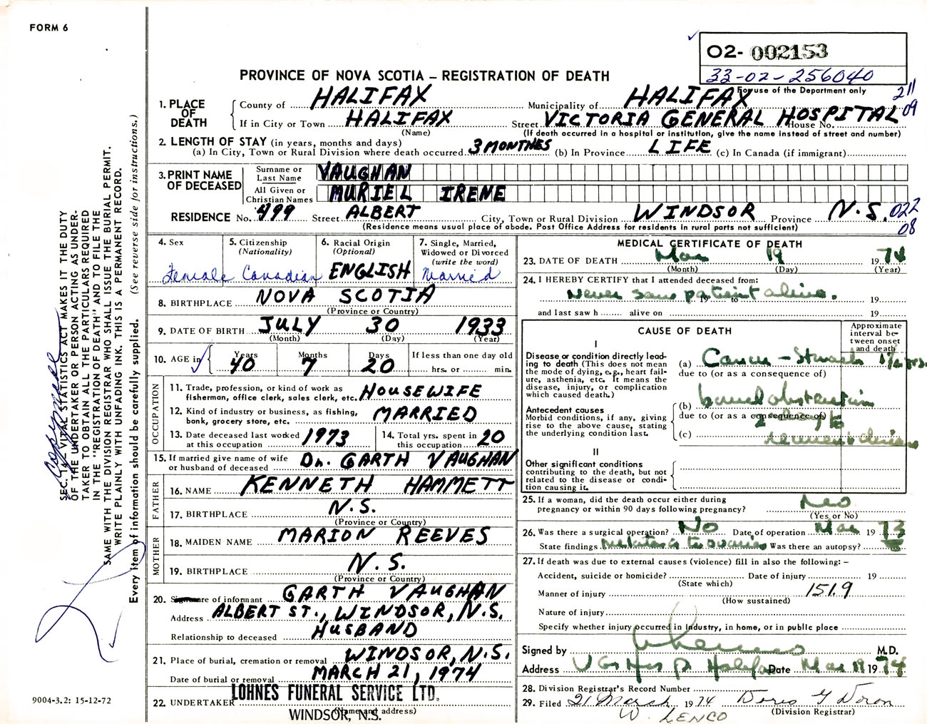 Female Death Registration: Year: 1974 number: 2153