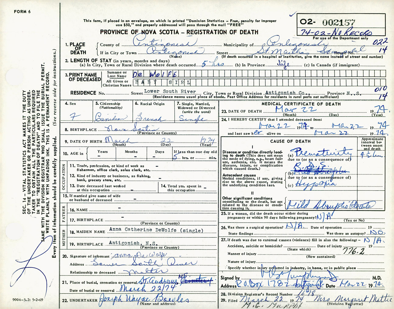 Female Death Registration: Year: 1974 number: 2157