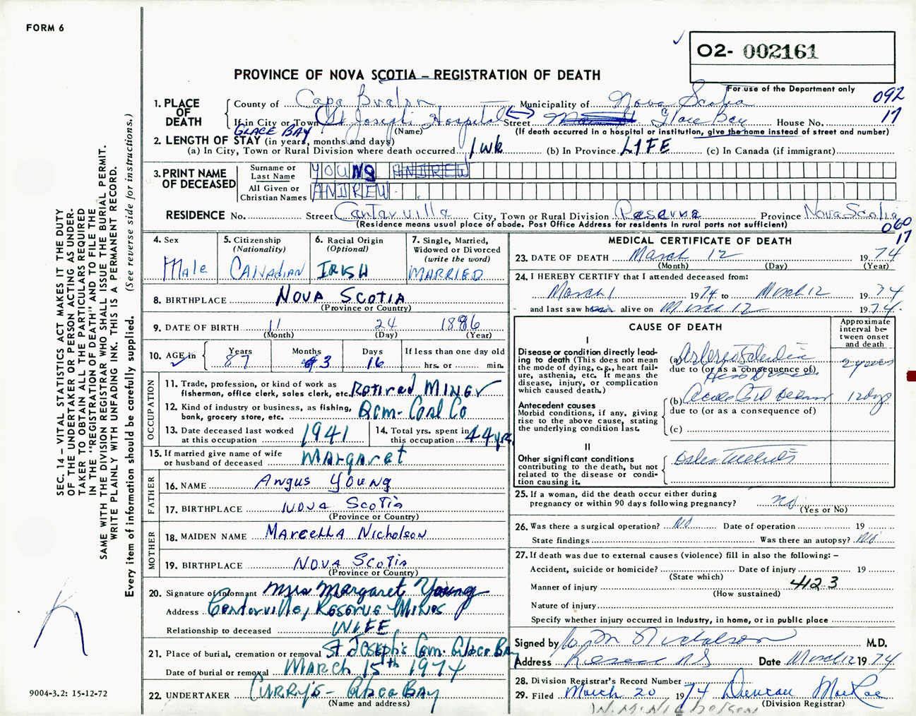 Male Death Registration: Year: 1974 number: 2161