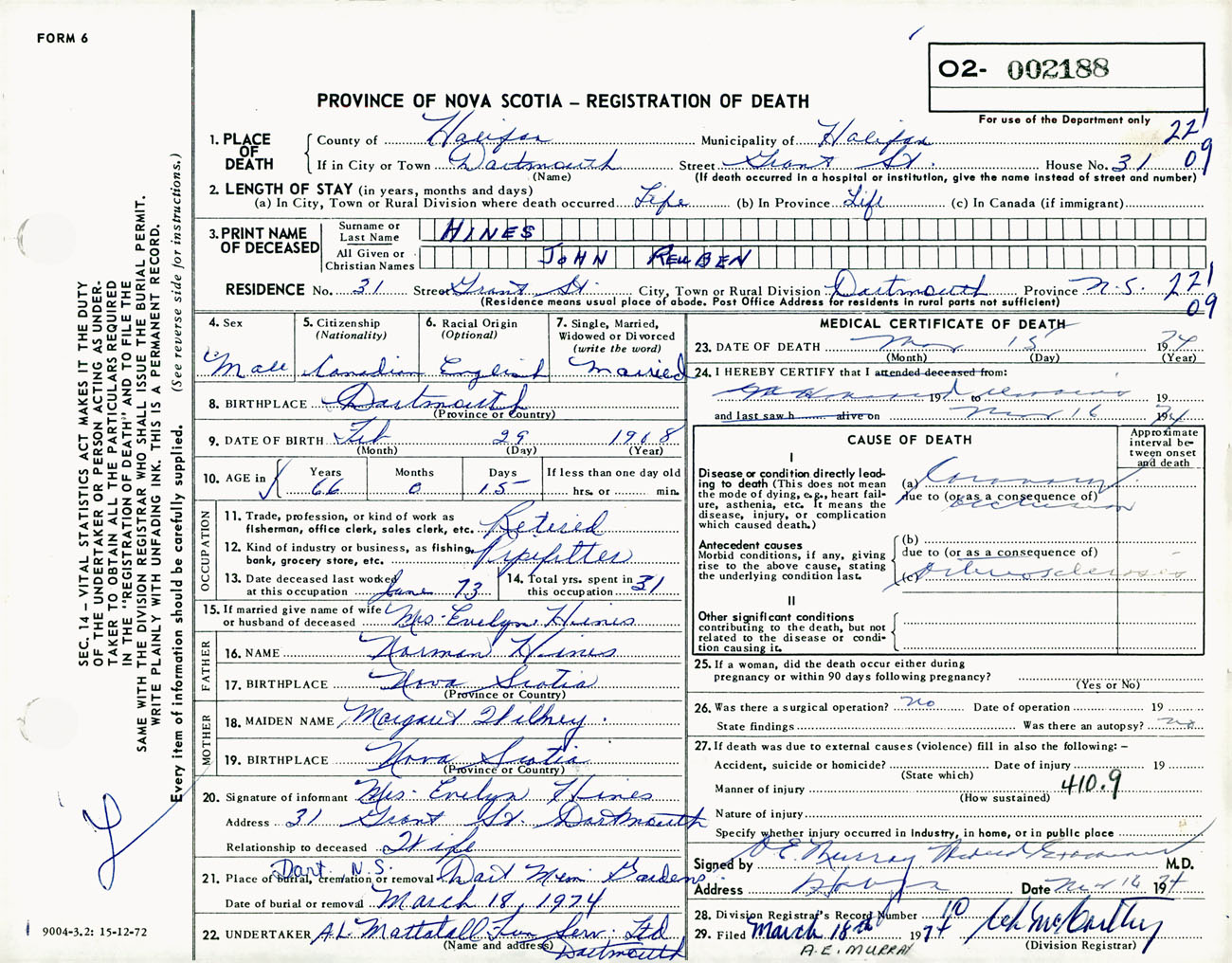 Male Death Registration: Year: 1974 number: 2188