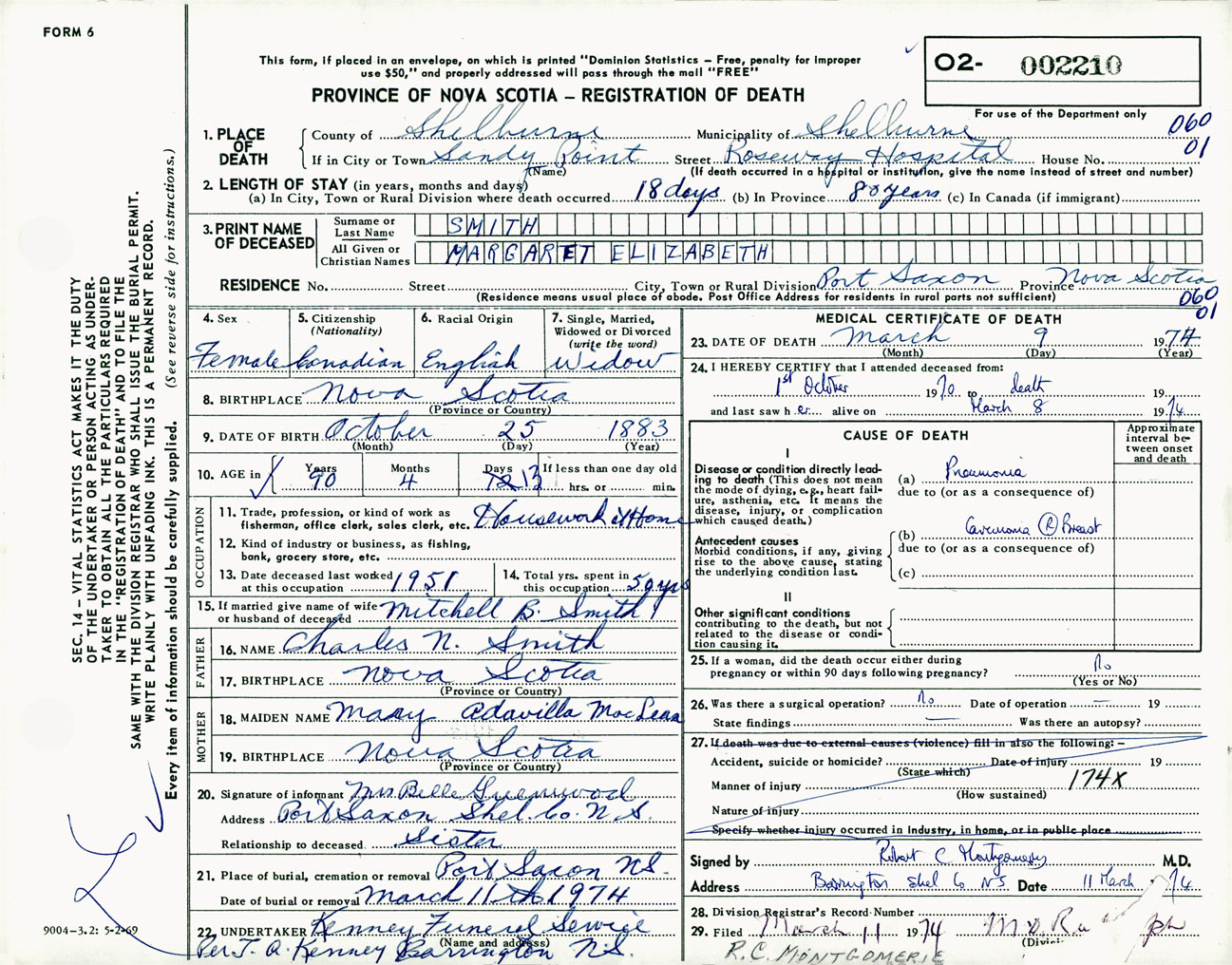 Female Death Registration: Year: 1974 number: 2210