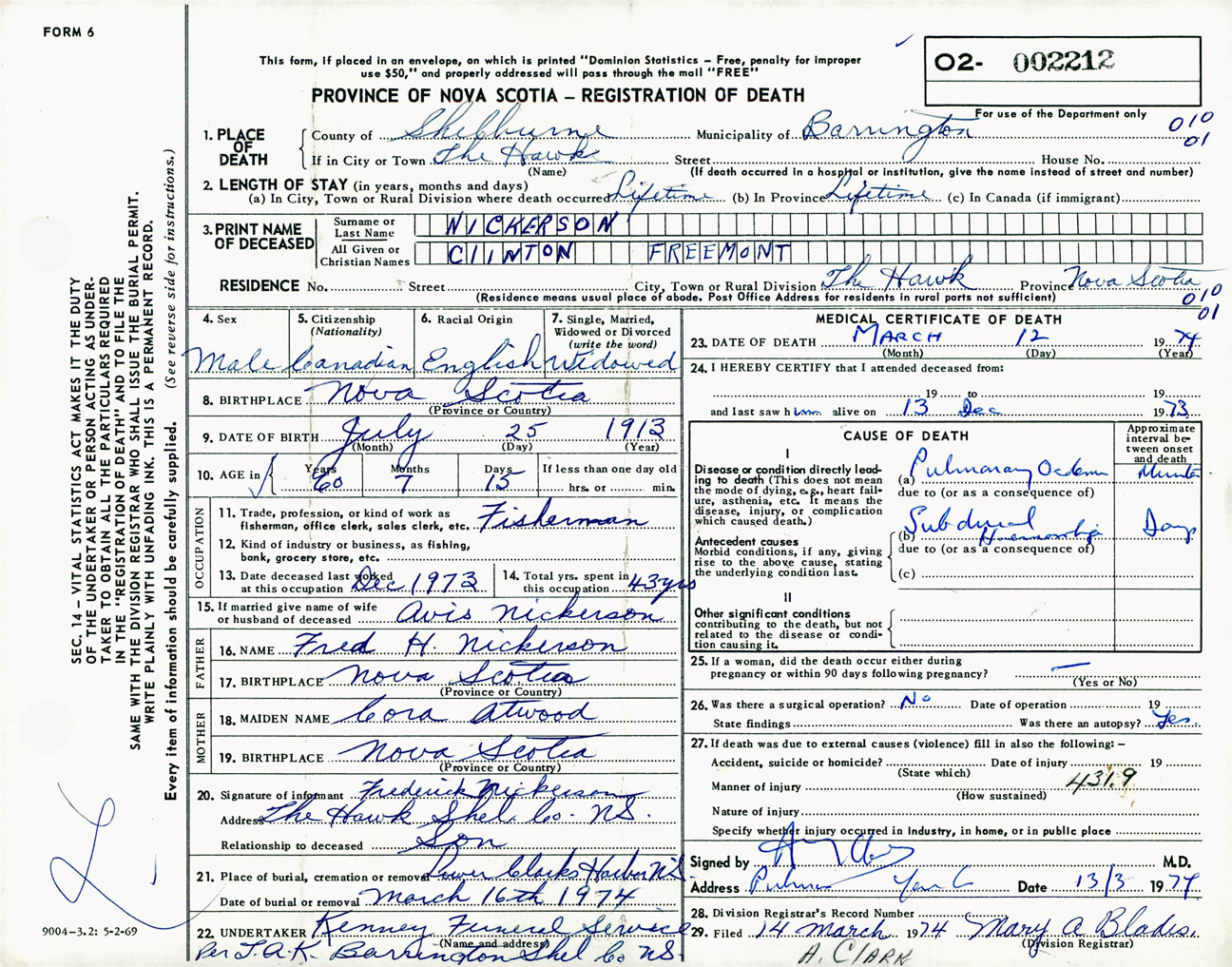 Male Death Registration: Year: 1974 number: 2212