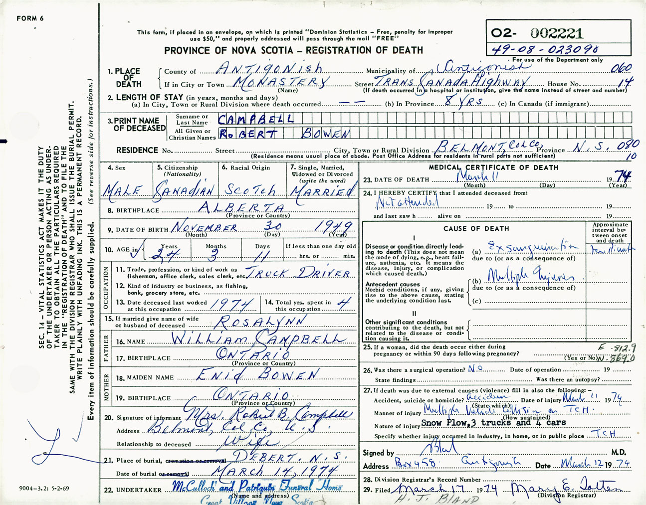 Male Death Registration: Year: 1974 number: 2221