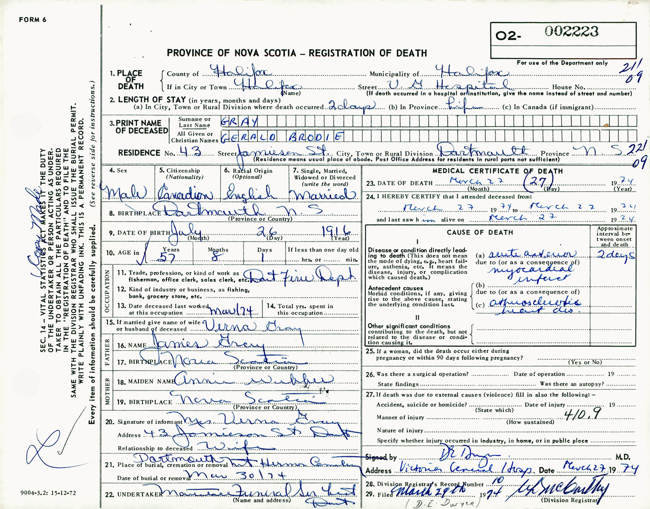 Male Death Registration: Year: 1974 number: 2223