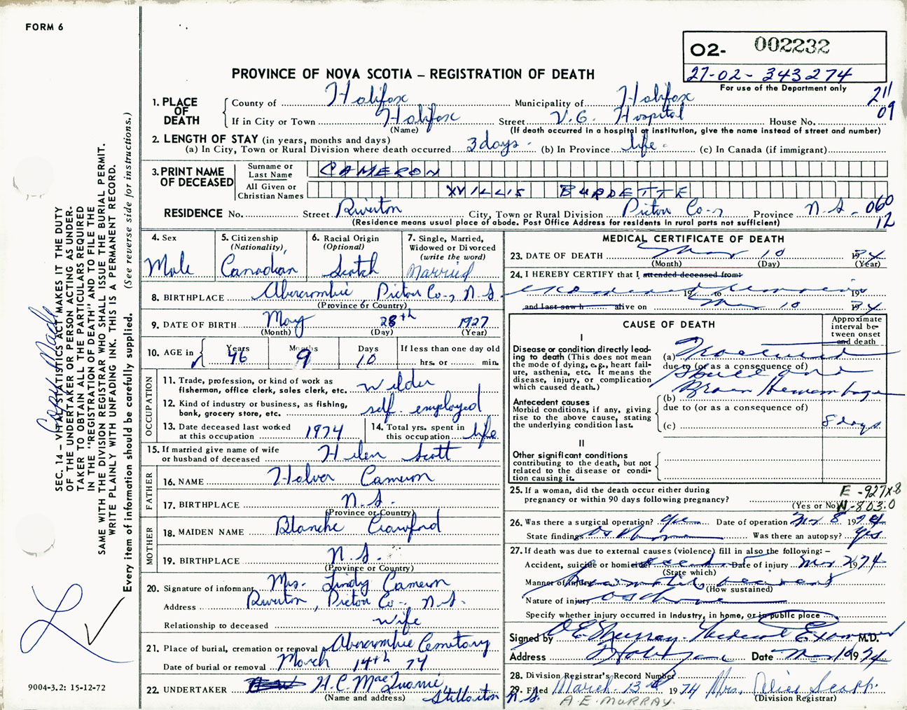 Male Death Registration: Year: 1974 number: 2232