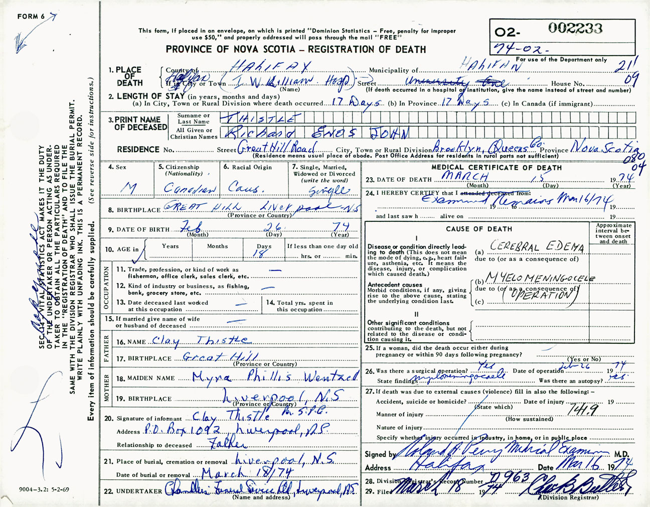 Male Death Registration: Year: 1974 number: 2233