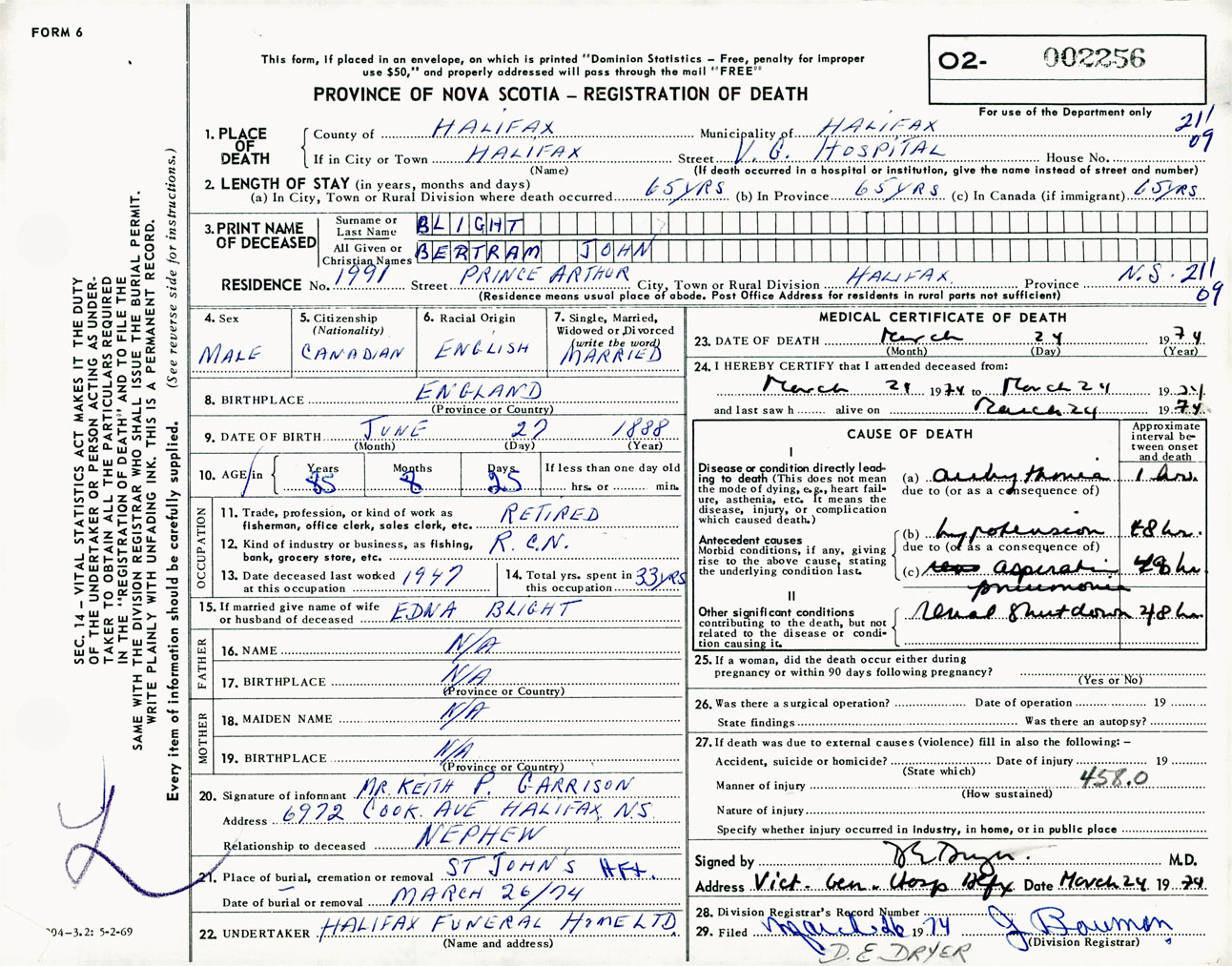 Male Death Registration: Year: 1974 number: 2256