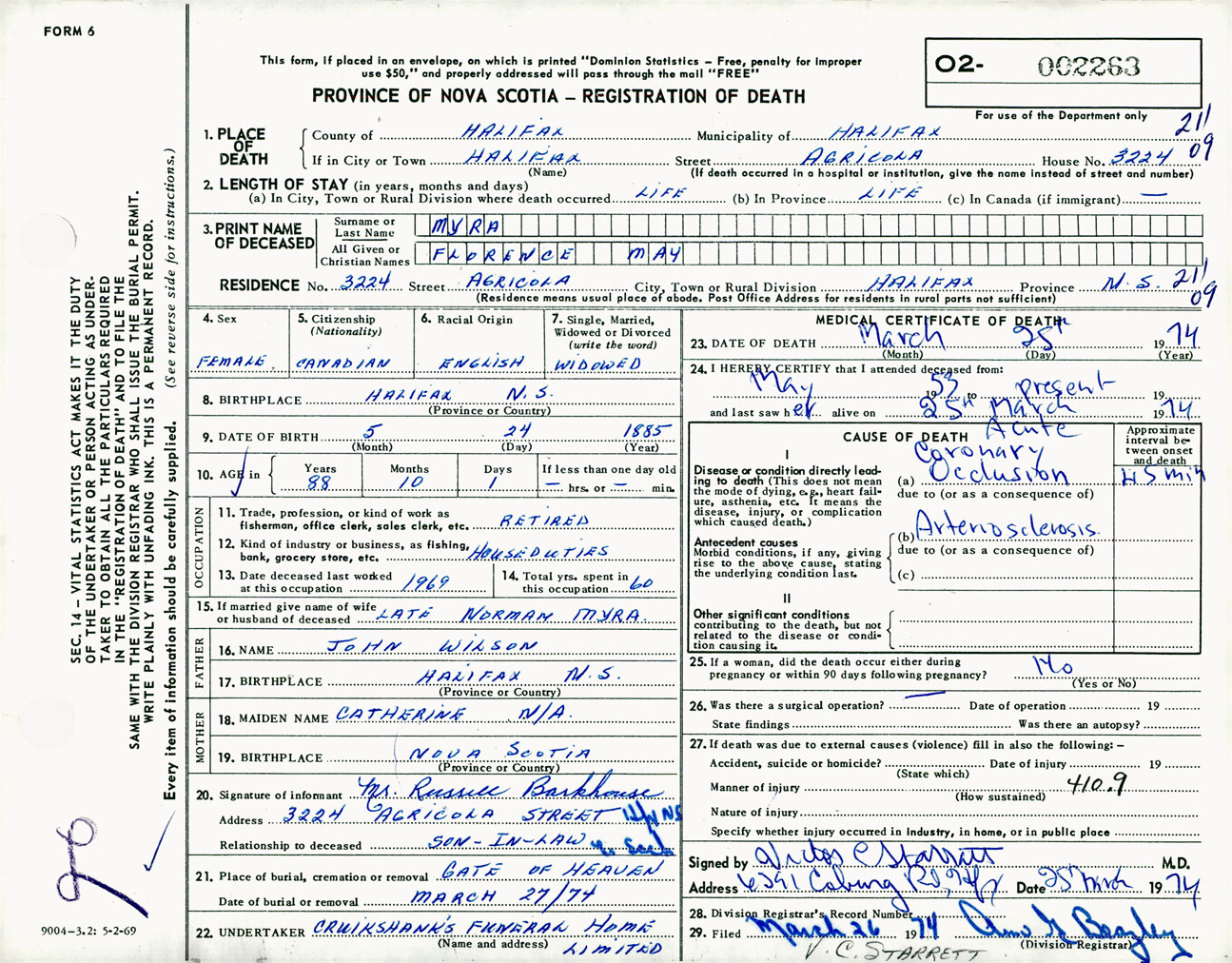 Female Death Registration: Year: 1974 number: 2263