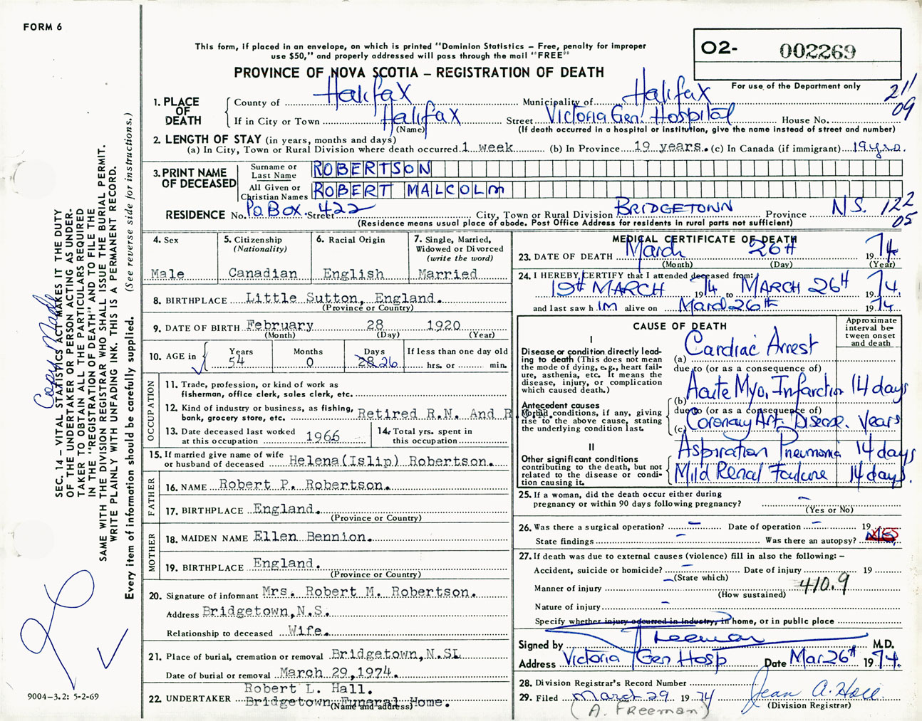 Male Death Registration: Year: 1974 number: 2269