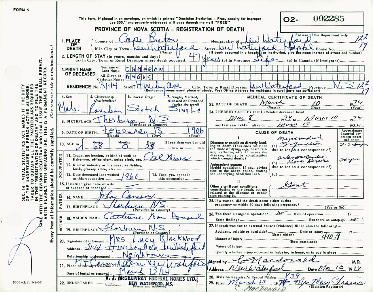 Male Death Registration: Year: 1974 number: 2285