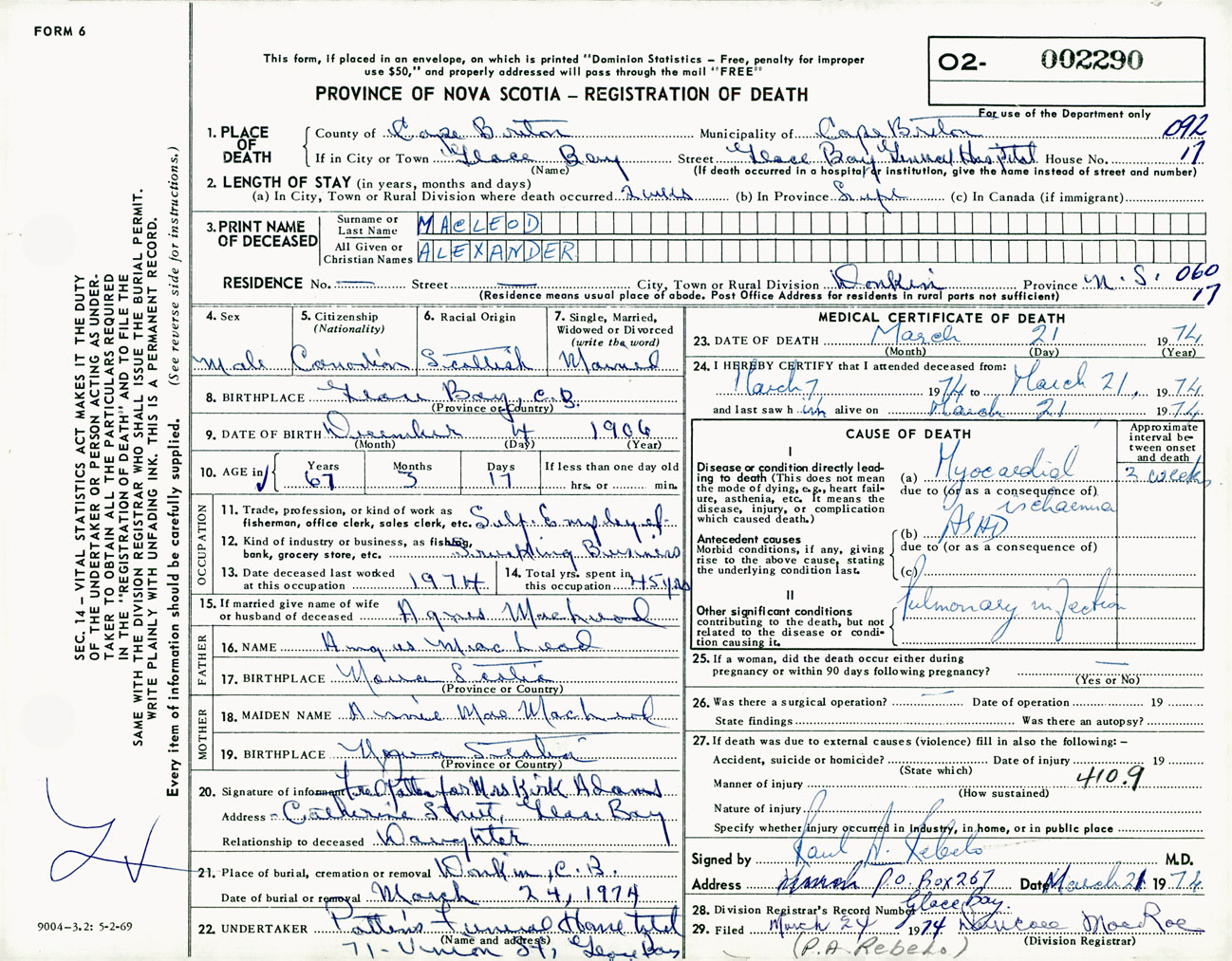 Male Death Registration: Year: 1974 number: 2290