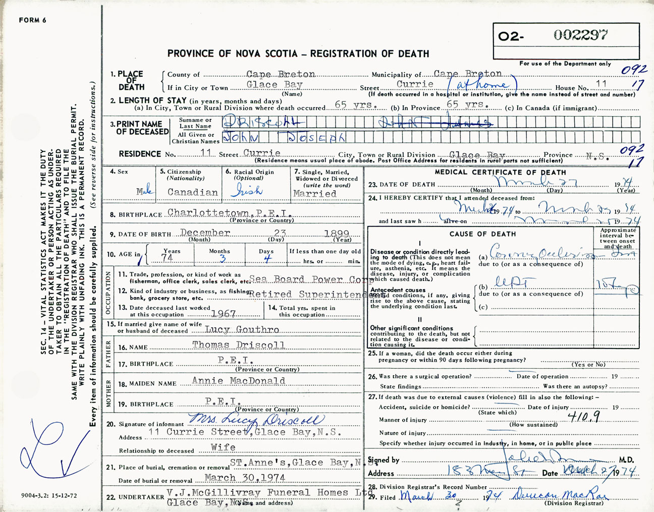 Male Death Registration: Year: 1974 number: 2297