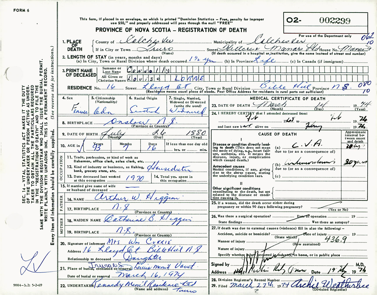 Female Death Registration: Year: 1974 number: 2299