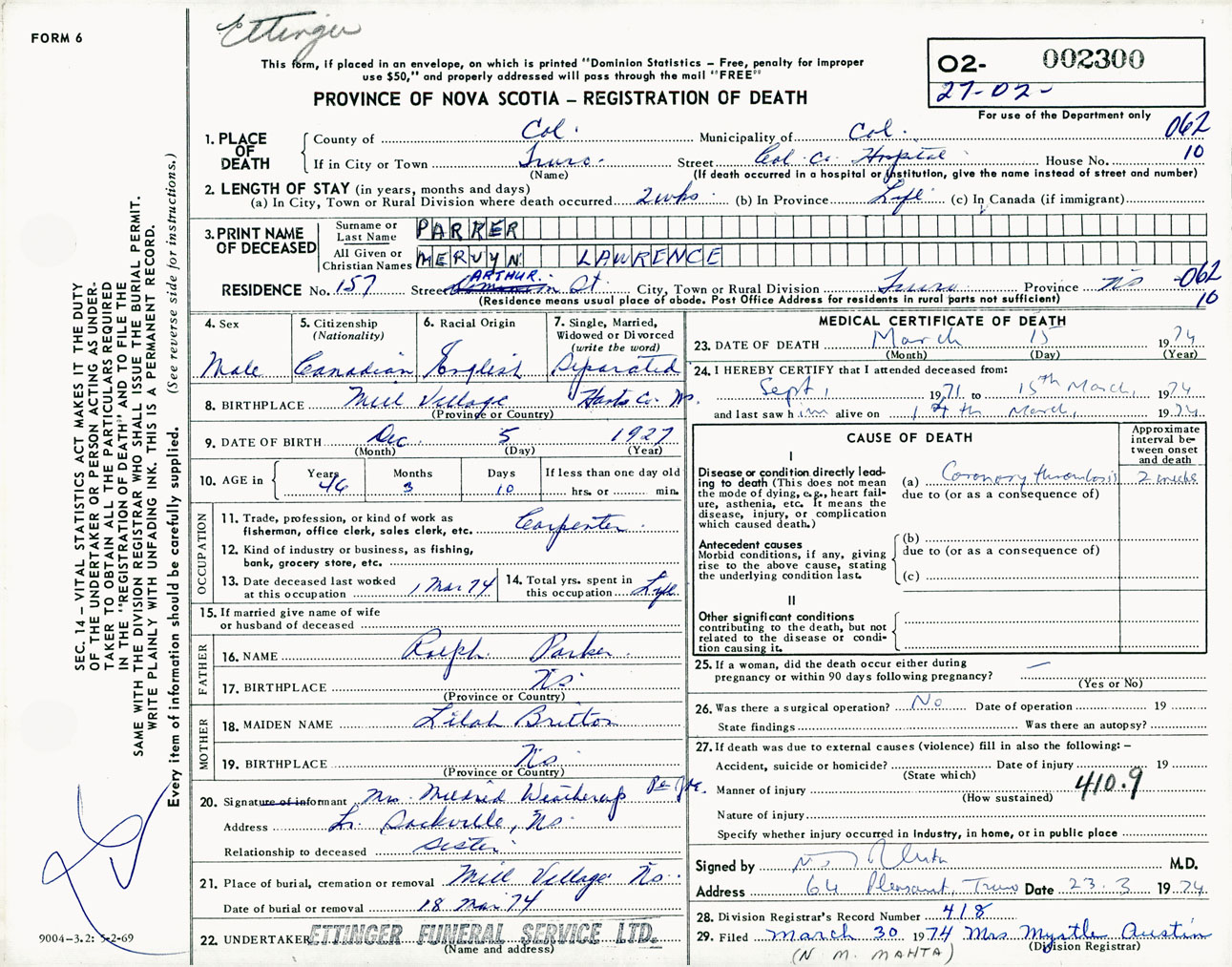 Male Death Registration: Year: 1974 number: 2300