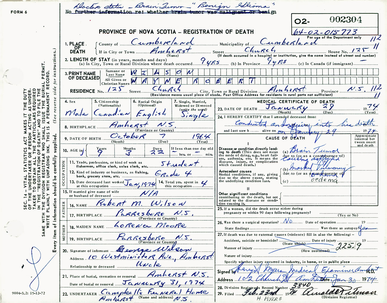 Male Death Registration: Year: 1974 number: 2304