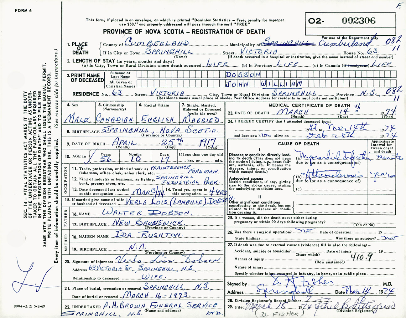 Male Death Registration: Year: 1974 number: 2306