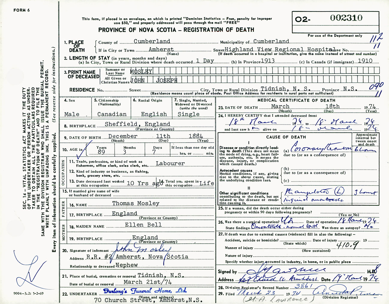 Male Death Registration: Year: 1974 number: 2310
