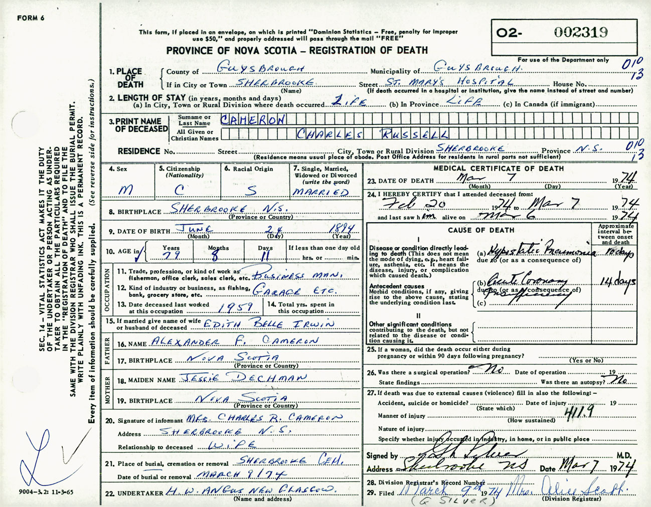 Male Death Registration: Year: 1974 number: 2319