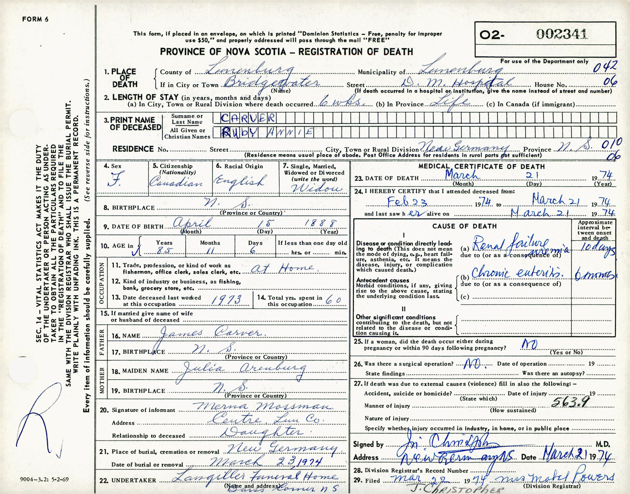 Female Death Registration: Year: 1974 number: 2341