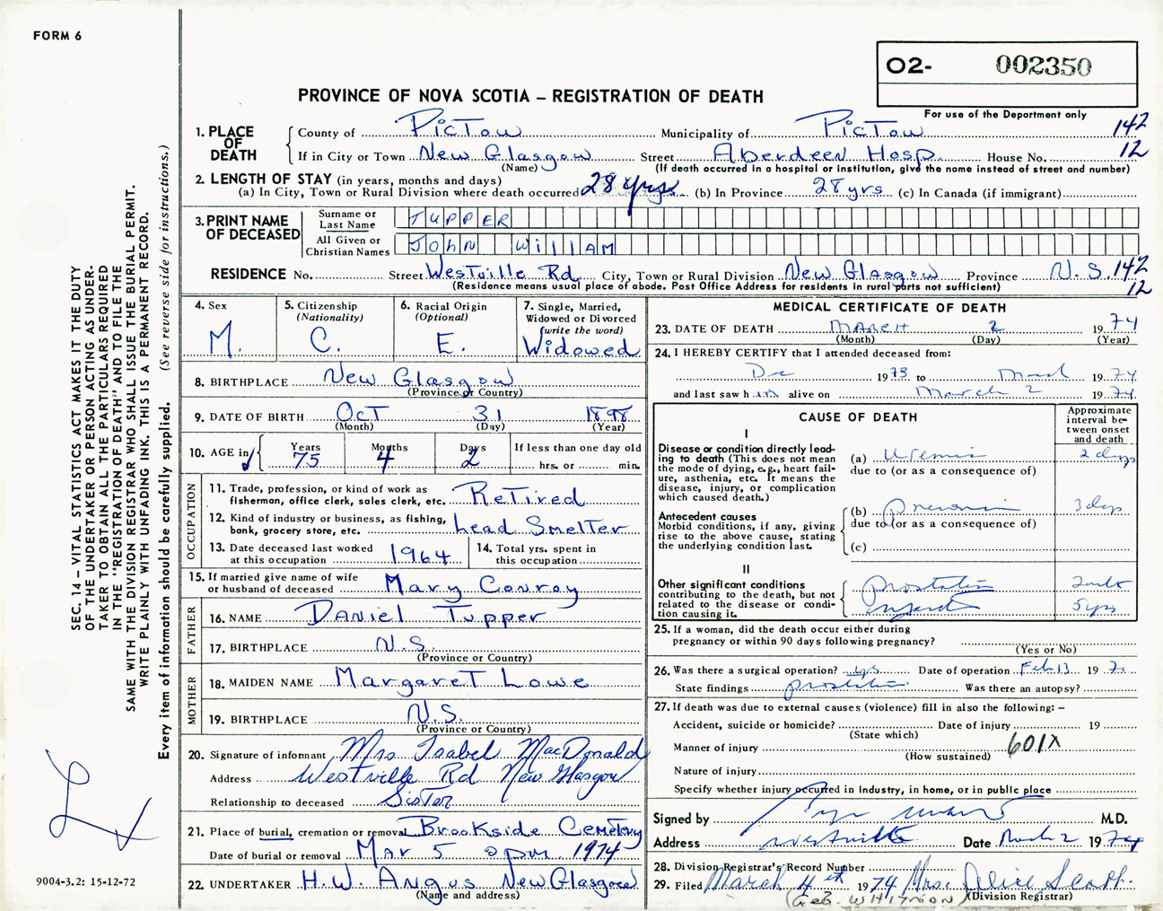 Male Death Registration: Year: 1974 number: 2350