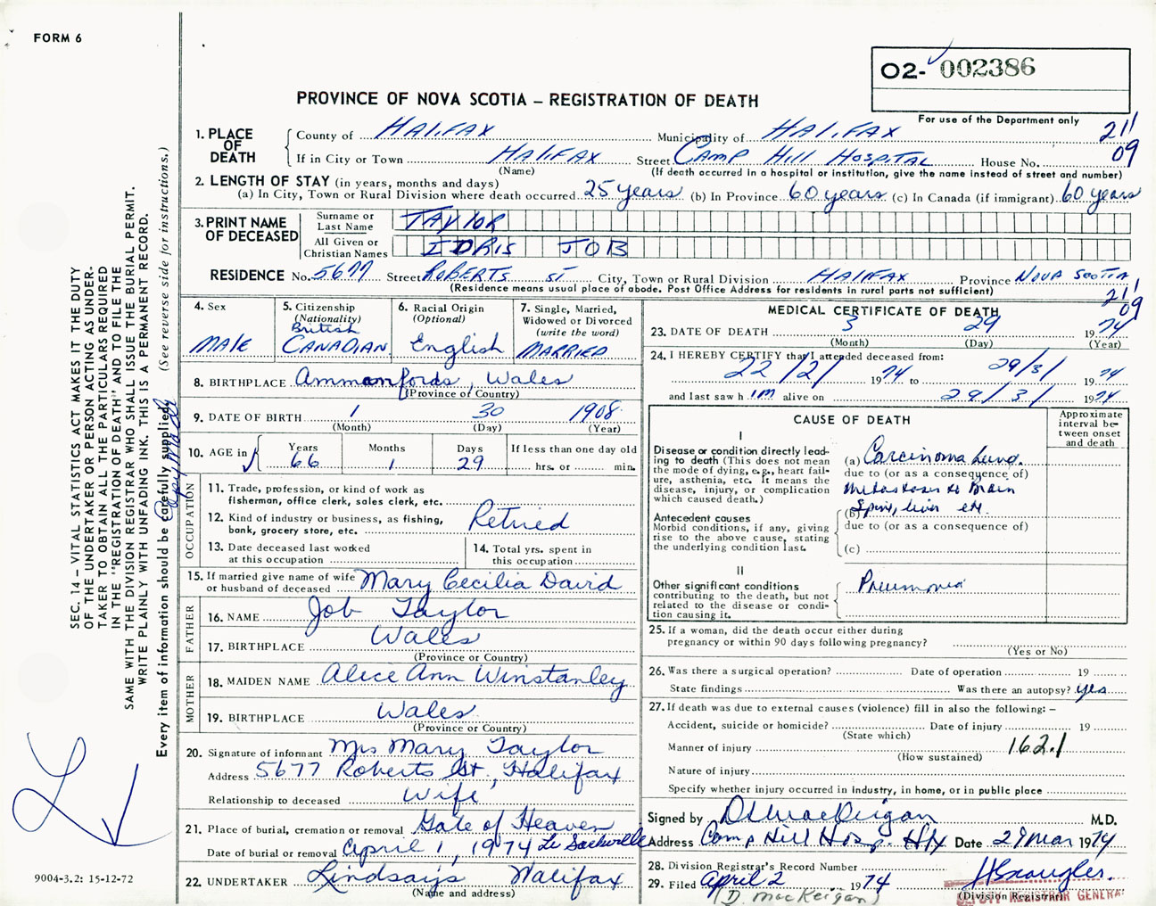 Male Death Registration: Year: 1974 number: 2386