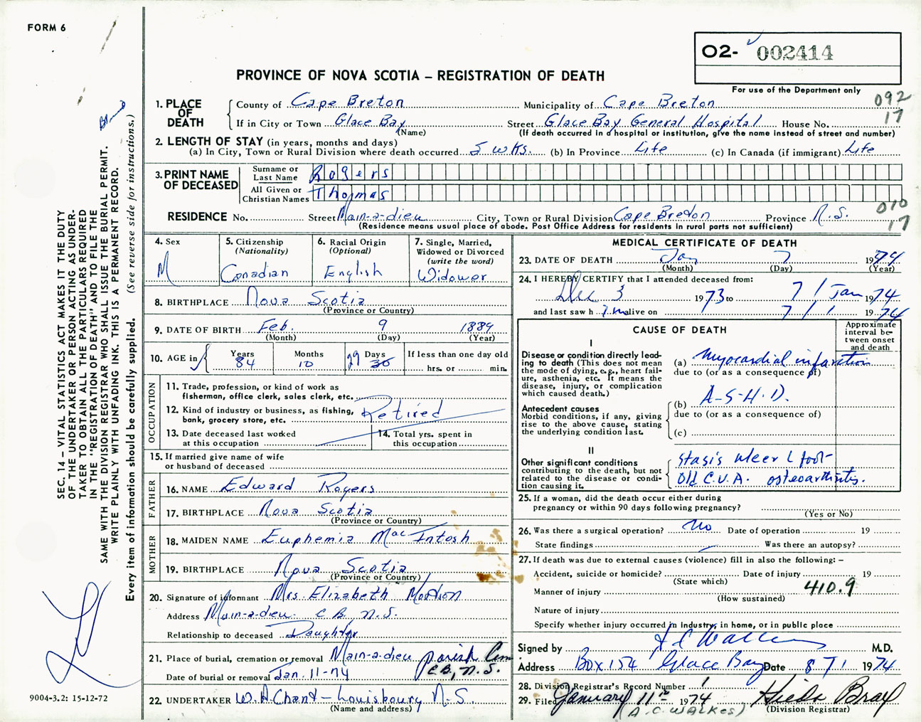 Male Death Registration: Year: 1974 number: 2414