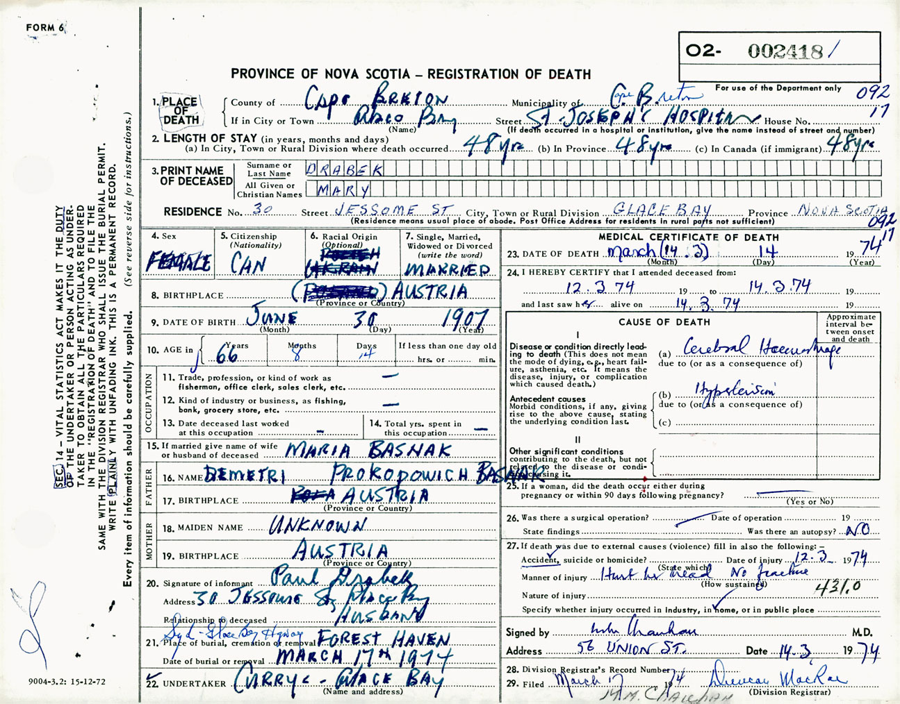 Female Death Registration: Year: 1974 number: 2418