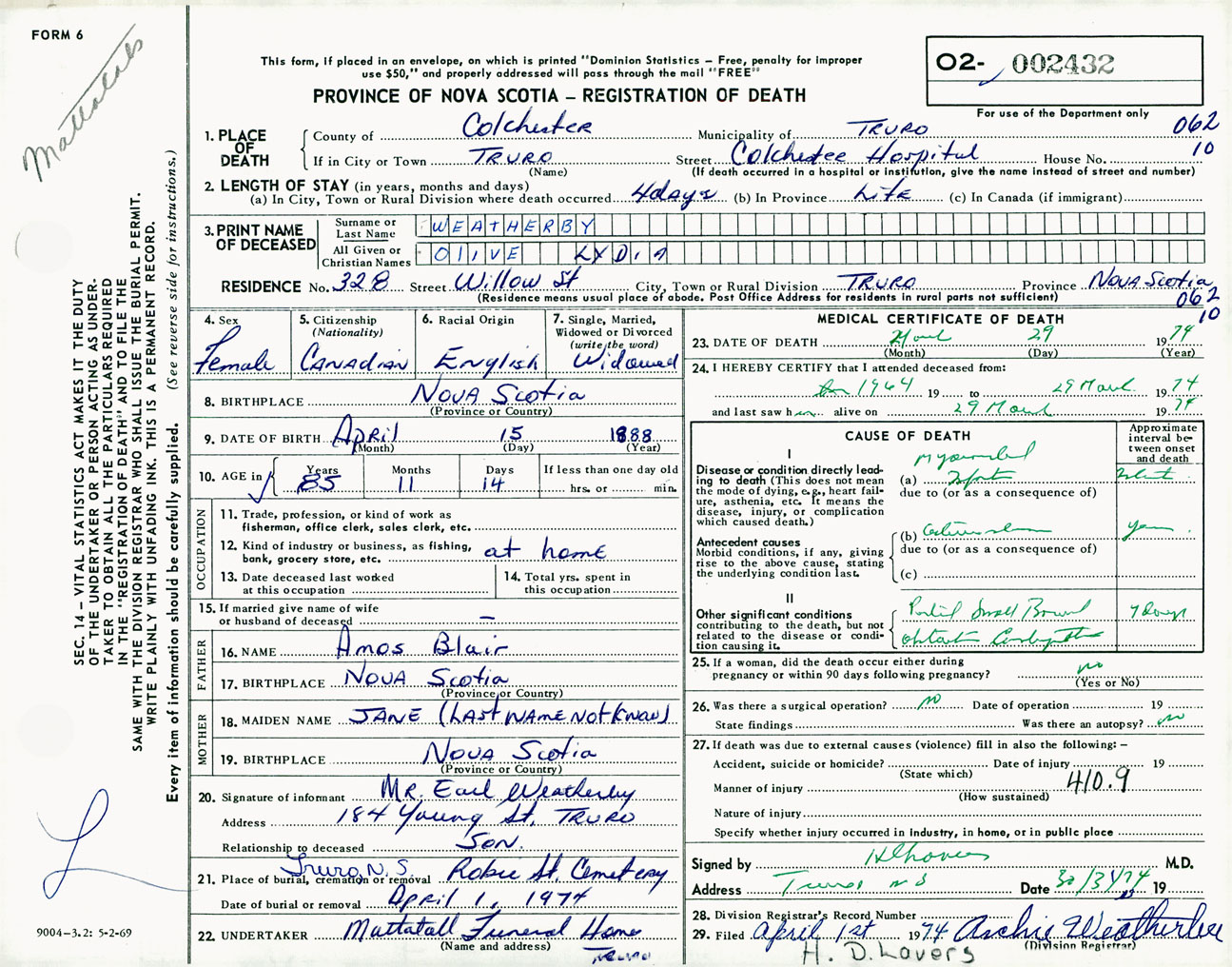 Female Death Registration: Year: 1974 number: 2432