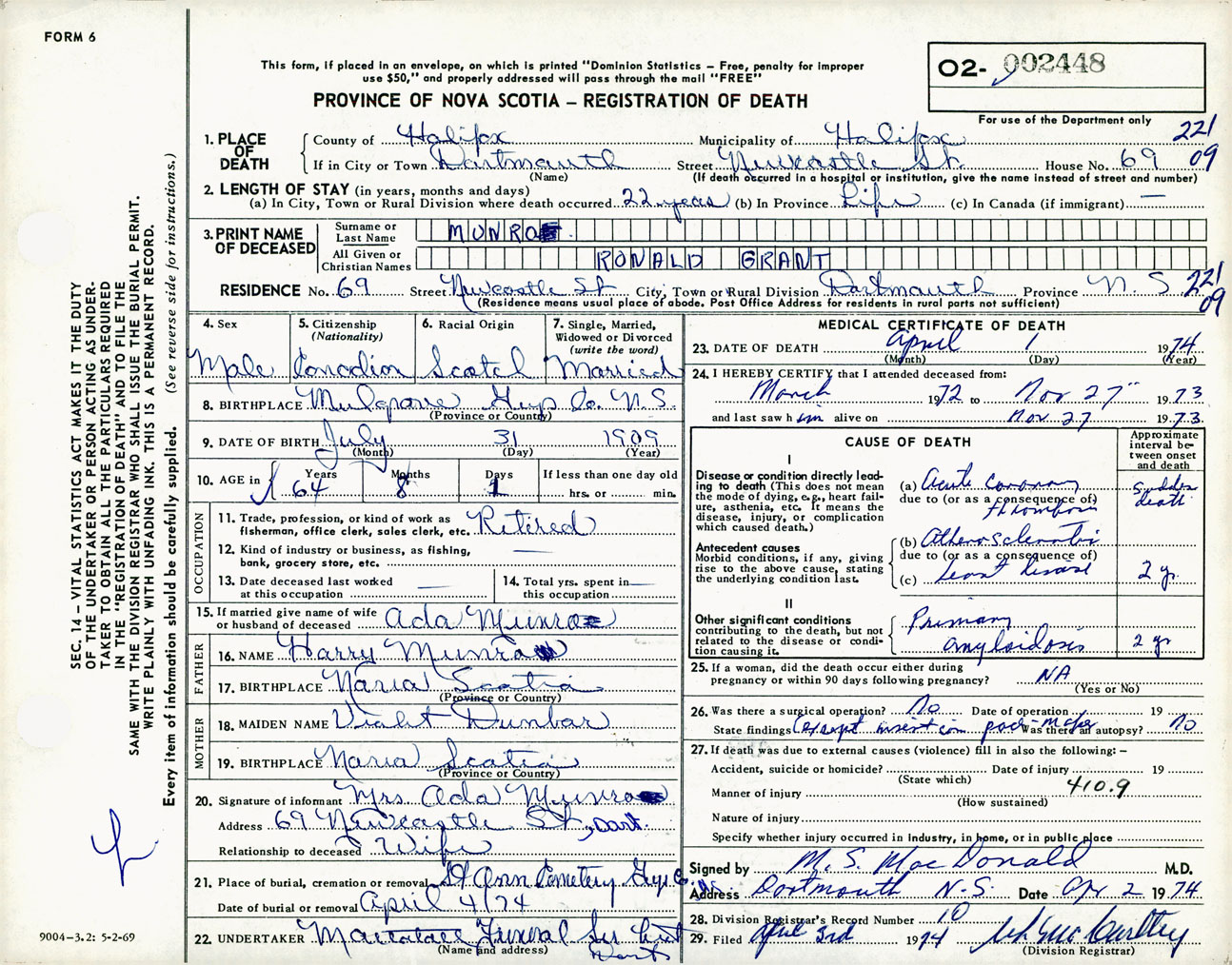 Male Death Registration: Year: 1974 number: 2448