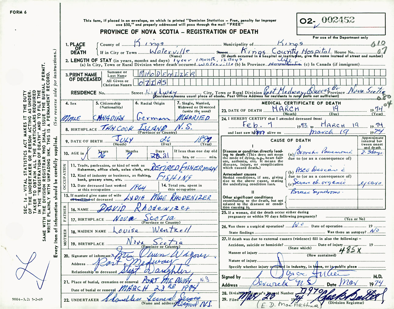 Male Death Registration: Year: 1974 number: 2452