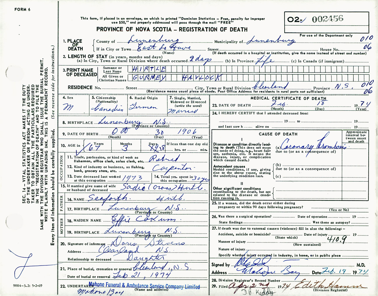 Male Death Registration: Year: 1974 number: 2456