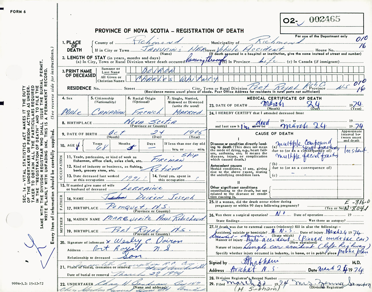 Male Death Registration: Year: 1974 number: 2465