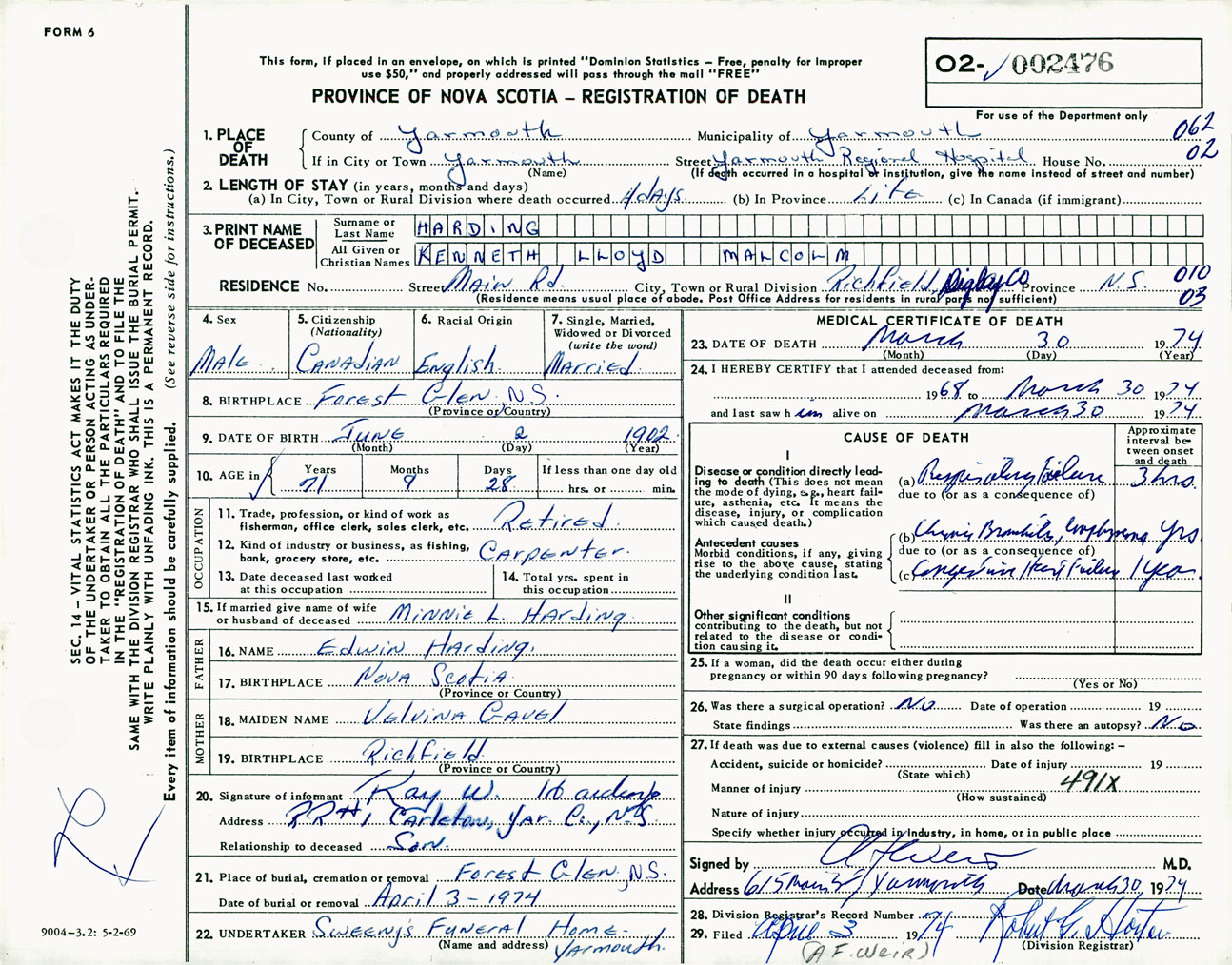 Male Death Registration: Year: 1974 number: 2476