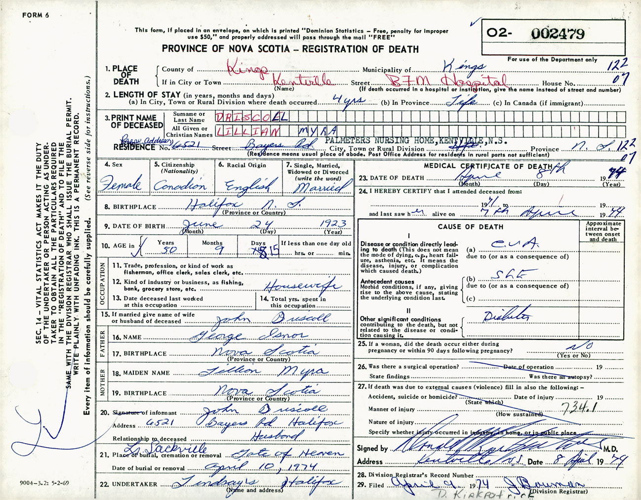 Female Death Registration: Year: 1974 number: 2479