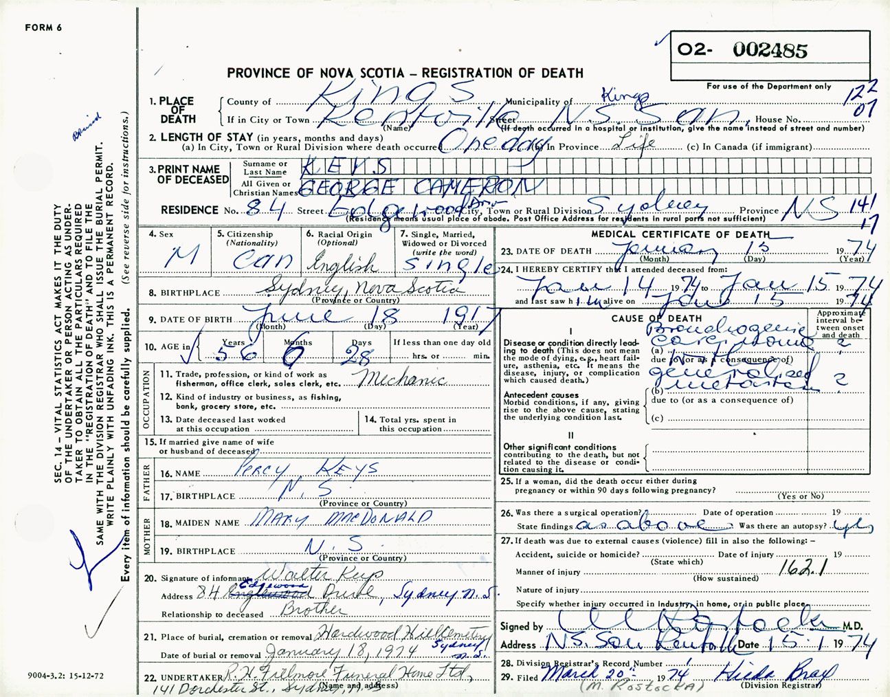 Male Death Registration: Year: 1974 number: 2485