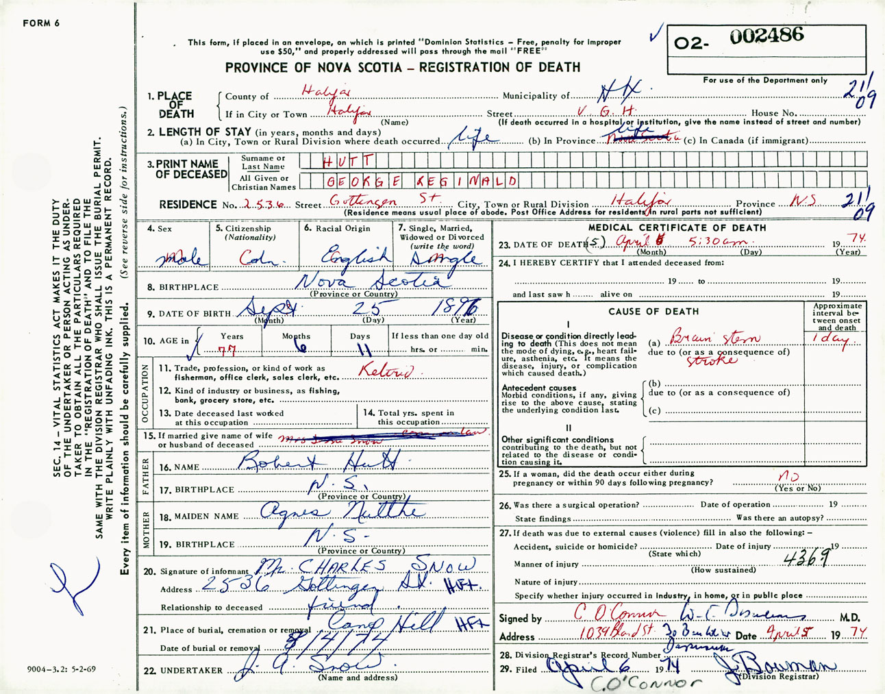 Male Death Registration: Year: 1974 number: 2486