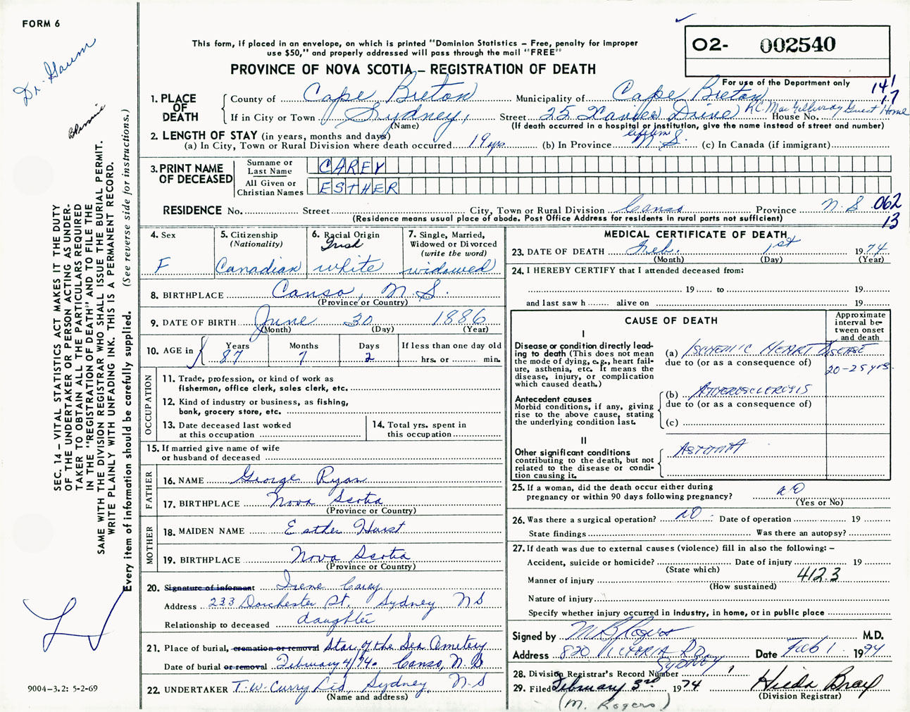 Female Death Registration: Year: 1974 number: 2540