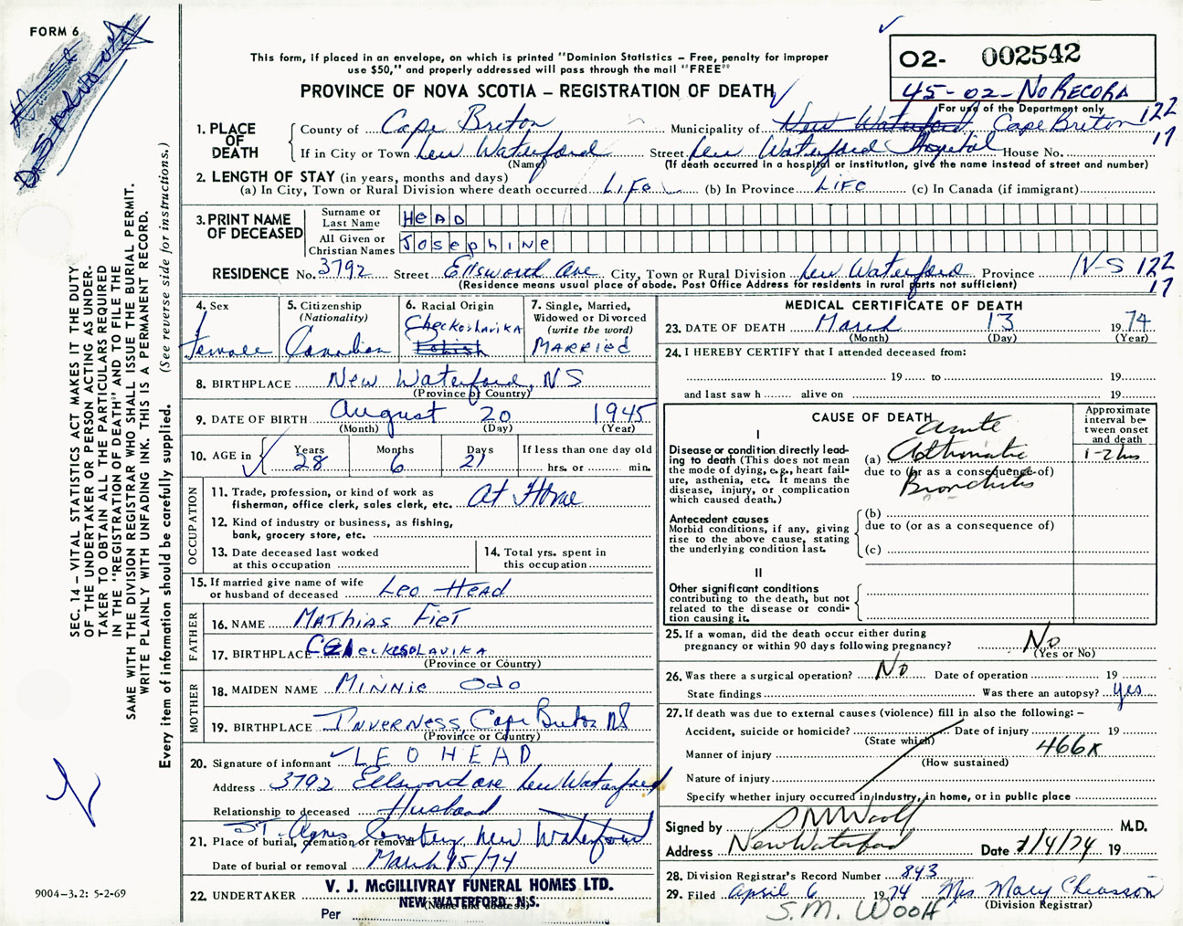 Female Death Registration: Year: 1974 number: 2542