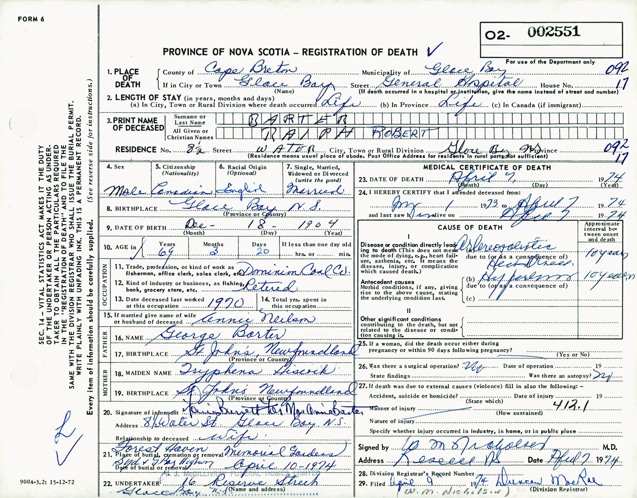 Male Death Registration: Year: 1974 number: 2551